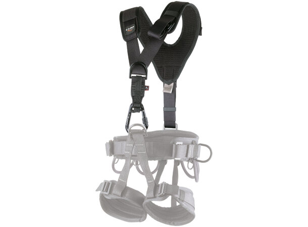 Ergonomic padded chest harness can be used to convert the Liberty sit harness into a full body fall arrest harness. Front sternal attachment point.