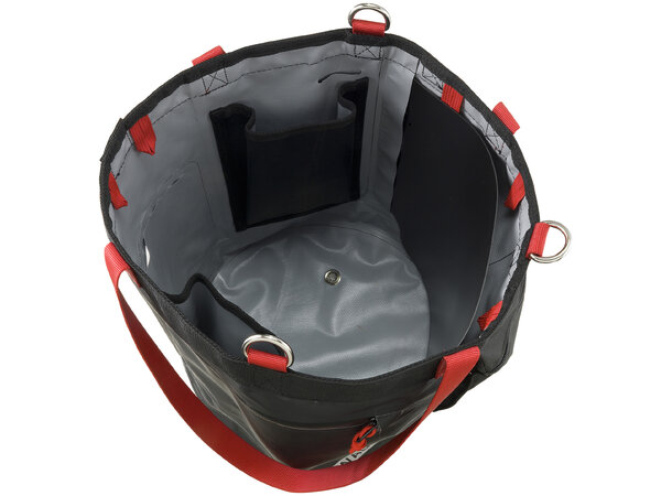 Tydelige røde stropper gjør det enkelt å få tak i bøtta når du skal koble den fast for heising. Stroppene er lange og samtidig smale nok til at de ikke er i veien. Her finner du raskt frem til verktøy og utstyr. Det er også tre små D-ringer langs toppen av bøtta for sikring av verktøy eller som opphengspunkter for å henge opp selve bøtta.