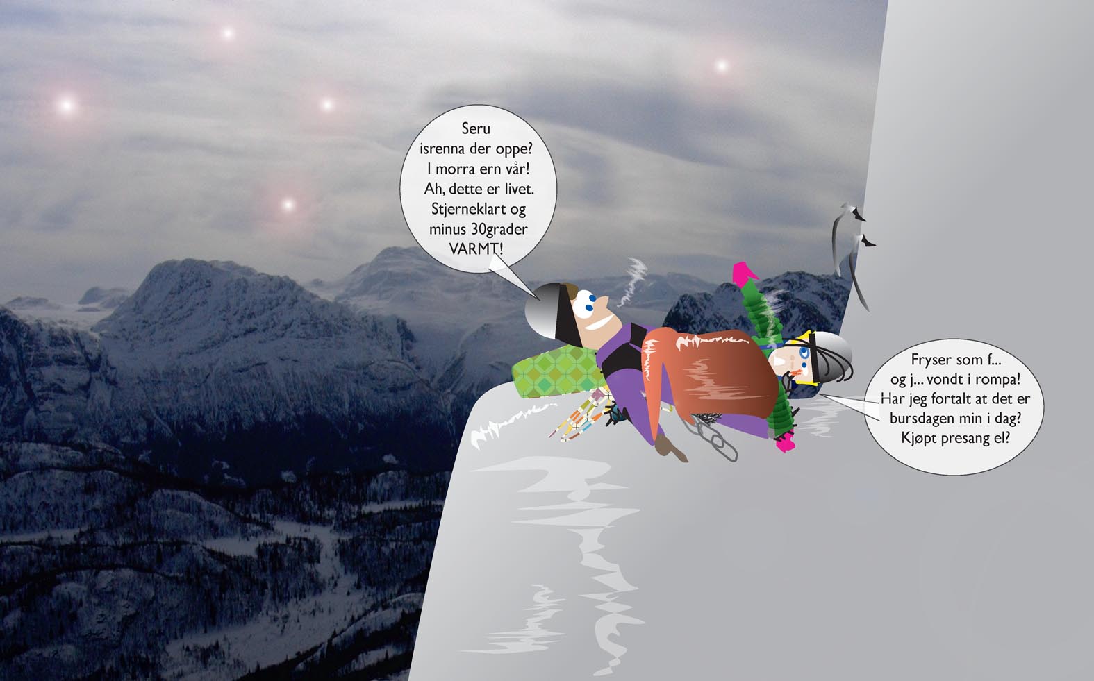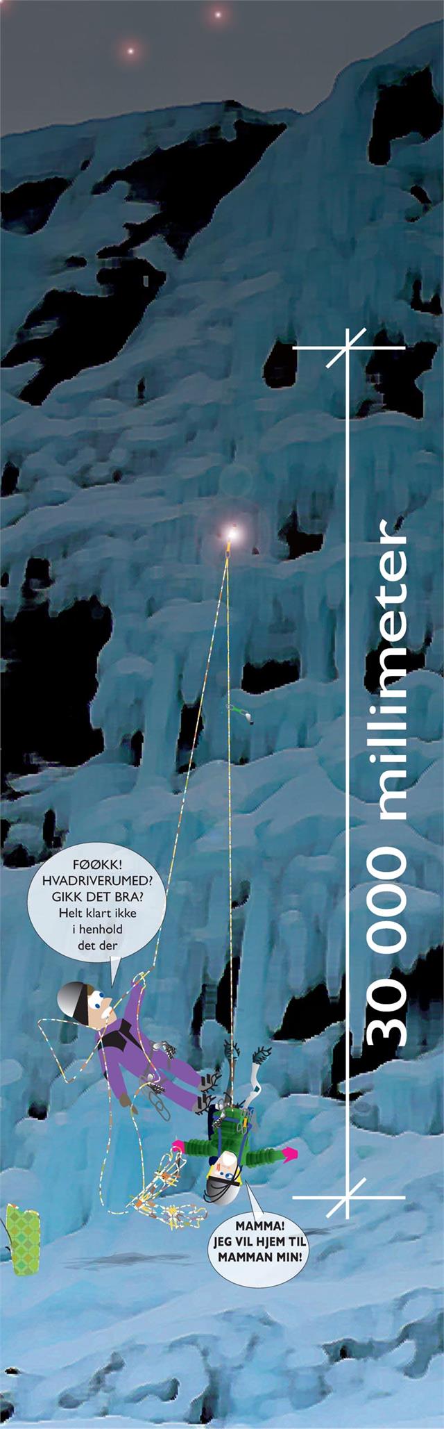 Jeg hang oppepå Olsen som hadde føket ut til siden og opp da tauet strammet seg, Jeg hadde gått i bakken på elastikken. Rompa dunket av smerte, men ellers var jeg ok. Summet oss og Olsen skulle overta. Han syntes isen var kjip. Kanskje ikke så rart i minus 20?