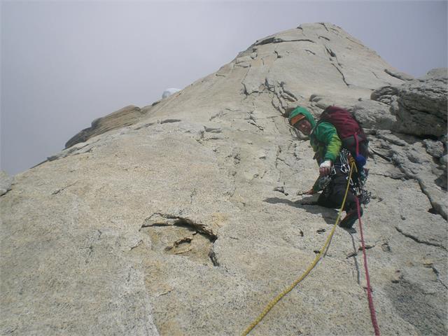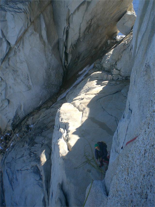 Den vanlige måten å komme seg ned fra Aguja Standhardt på er å rappellere “Exocet”, iskaminen i østveggen. Vi var fortsatt en håndfull taulengder fra denne, og hadde nå som eneste mulighet å ta oss nedover ruten vi hadde klatret opp, et dusin bratte taulengder i stadig økende vind. Vi skjønte med en gang at her gjaldt det å improvisere, men uten å ta snarveier. Ganske raskt puttet vi det ene tauet i sekken og rappellerte på bare det ene tauet. Da var det mindre tau som kunne blåse bort og sette seg fast, og vi hadde et tau i bakhånd i tilfelle noe gikk galt. Et sted kunne vi tre en klemknuteslynge bak et flak, men oftest måtte vi henge igjen noen av sikringsmidlene våre.