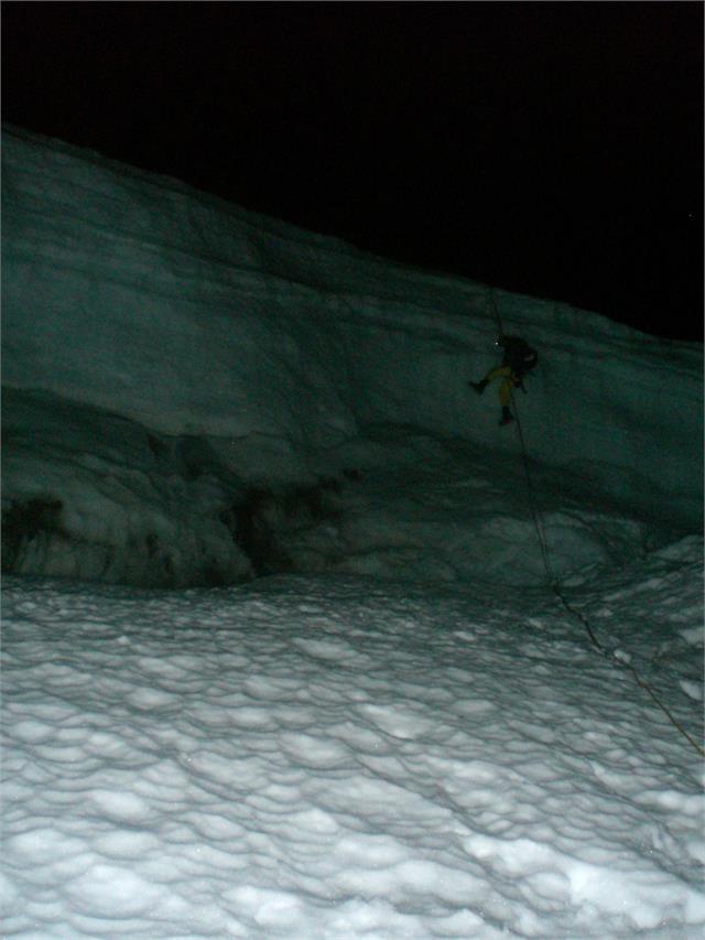 Heldigvis, etter et knippe rappeller kom vi litt i le i østsiden, og det ble lettere å snakke sammen. Ikke at vi hadde så mye å snakke om, vi visste begge at her var det bare en ting som gjaldt; nedover. Etter hvert måtte hodelyktene på, men selv om vinden var ekstremt sterk da vi passerte skaret hvor klatreruten starter merket vi at temperaturen hadde steget noen hakk. I det vi firte oss inn i natten og nedover breen mot dalen merket vi at stormen holdt på å roe seg. Det virket som om vi hadde sluppet fra det med skrekken. Vi hadde fortsatt en del kamsikringer igjen, men kilesettet besto nå av et par mikrokiler. En av dem satte vi igjen for å forsterke en knivbladbolt vi fant da vi skulle rappellere over en bregleppe.