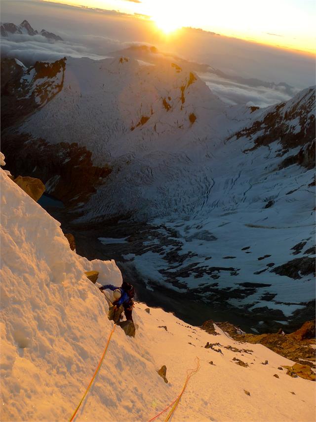 Krukset på ruten var å passere et klippebånd som skiller toppen av breen fra de øvre snøbakkene. Steinkvaliteten var rufsete, men heldigvis var klatringen grei nok, bare man var ytterst forsiktig med hva man dro i. Etter to korte taulengder var vi over på snøbakkene, og hadde toppen innenfor rekkevidde.