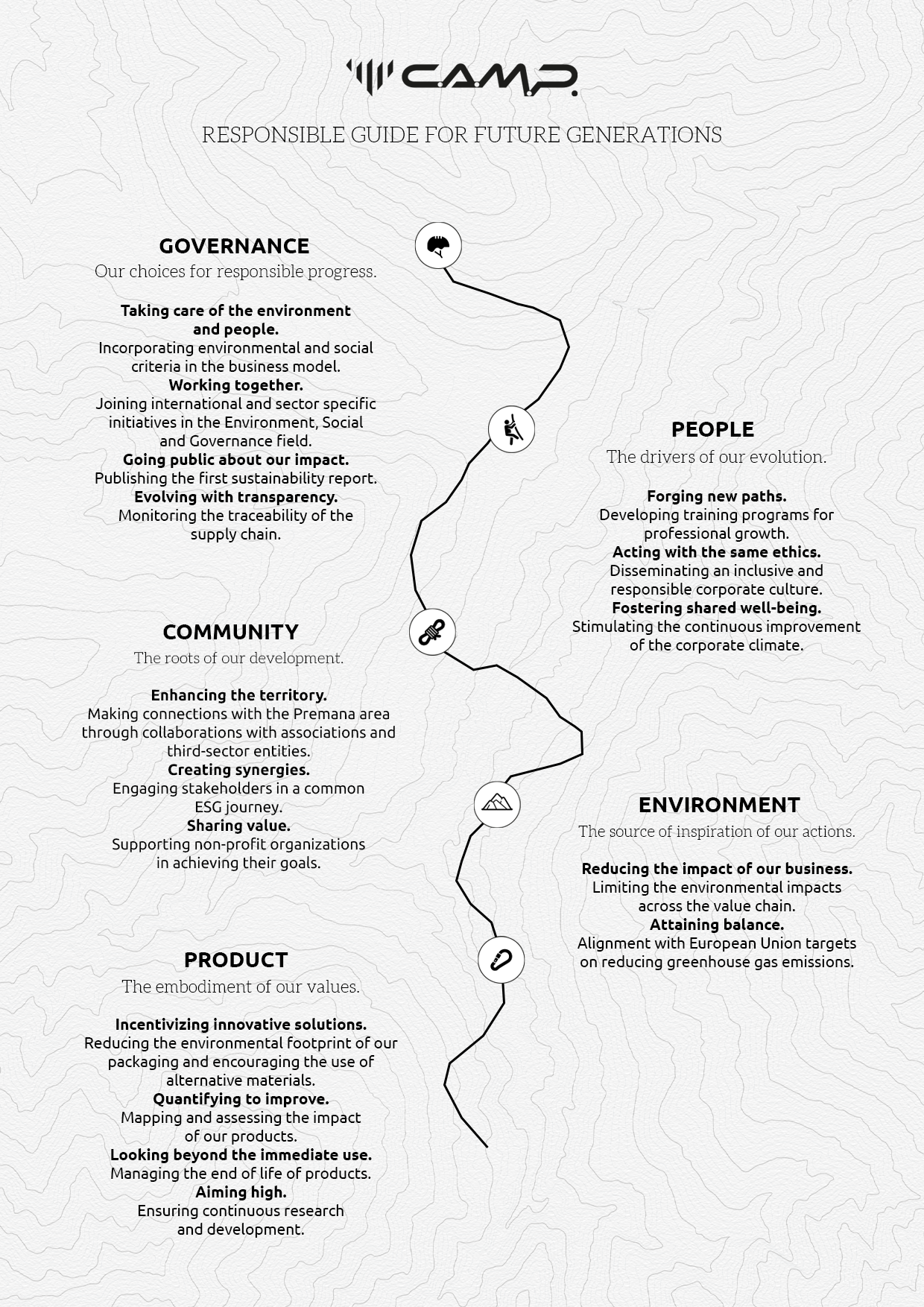 «We called it “Responsible Evolution”, recalling the claim “Evolutionary” that we have introduced with our rebranding. Adopting an ESG Agenda is for us a new challenge more in its form than in its essence – forklarer president Eddy Codega. "Siden 1889 har C.A.M.P. jobbet i et ekte fjellområde, langt fra de større kommunikasjonsmidlene, og dermed teoretisk sett ikke det ideelle stedet for å drive virksomhet. Vårt ESG-program finner derfor sin plass i en visjon som går langt tilbake i tid, og det integreres fullt ut med den. Vi vil fortsette med det vi har gjort så langt, samtidig som vi forbedrer det: Den virkelige nyheten er at vi vil operere strukturert, med forpliktelsen og gleden av å håndtere, dele og kommunisere vår tilnærming til disse spørsmålene på en organisk måte."