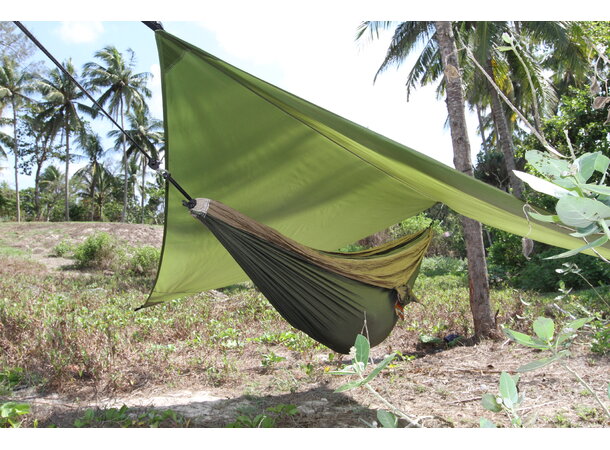Moon Tarp er perfekt for hengekøyeturer, bilturer, teltturer, fotturer og i leirplassen. Du kan lage både tak og levegg mot vind, sol og regn.